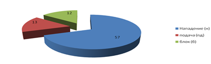 | 1 темп | Нападение (н) | 1 | 33% | 1 | 33% | 1 | 33% | 0 | 0% | 3 | 8% | |