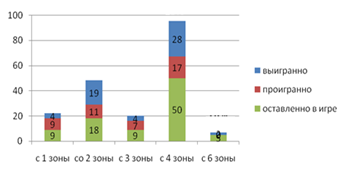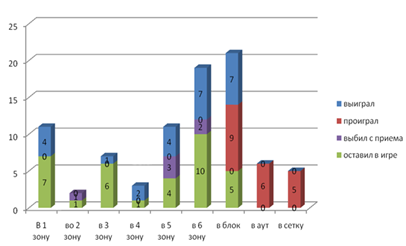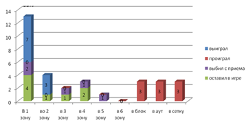 Проанализировав структуры различных методик анализа соревновательной деятельности, нами не были найдены элементы выполненных технических действий по зонам. Имея данный материал, тренерский состав мог бы видеть более подробную карту игры, как команды, так и игрока в частности. Это способствовало бы более результативному планированию тактической подготовки в соревновательной деятельности, а именно: загруженность зон в нападении; слабые и сильные зоны в защите и в блоке противников; качество выполнения нападения игрока с определенной зоны; вероятность нападения противника в определенную зону.