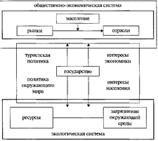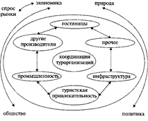 Стратегическая цель всего региона как конкурентной единицы — обеспечение конкурентоспособности на длительный период. Взаимодействие отраслей (гостиниц, транспортных предприятий, торговли), их рынков, населения и окружающего мира оказывает влияние на конкурентоспособность региона. Рынки предъявляют высокие требования к продукции и тем самым стимулируют работу отраслей, и наоборот: конкурентоспособные отрасли заинтересованы в сохранении и увеличении количества требовательных клиентов на местах. Отрасли, получающие от туризма хорошую прибыль, формируют определенное позитивное мнение у местного населения. Население, позитивно относящееся к туризму в своей местности, — гарантия гостеприимства, что облегчает реализацию инновационных туристских проектов. Взаимодействие окружающей среды и региона, особенно отношение населения к позитивным и негативным внешним эффектам или реакция на позитивные и негативные тенденции, также оказывает влияние на состояние конкурентоспособности. Туристский регион как конкурентную единицу схематически можно представить таким образом: