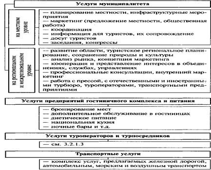 транспортные услуги размещение, питание обслуживание/сервис турпосреднические услуги организация объединение предложений в комплекс удобное размещение, характер, расстояние между местом отправления и назначения региональный, местный характер, степень комфорта пространственный объем финансовая и производственная организация |