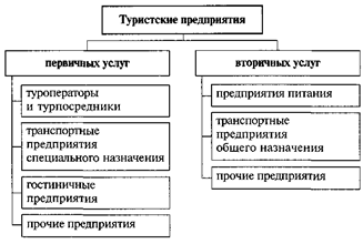 Туристские предприятия представляют собой третий важный компонент, создающий туристское предложение внутри подсистемы «объект туризма». В туристской отрасли функционируют различные туристские предприятия. Одни из них предоставляют клиентам исключительно туристские услуги, а для других туризм — это одно из нескольких направлений их коммерческой деятельности. Предприятия, существующие только за счет туризма, называются туристскими предприятиями сферы первичных услуг, а предприятия, получающие доходы не только от туристской деятельности, — туристскими предприятиями сферы вторичных услуг. Таким образом, услуги первых предприятий служат исключительно туризму и составляют основу его существования, а услуги второй группы предприятий удовлетворяют лишь некоторую часть туристского спроса, так как туризм для них — лишь один из многих источников существования и их услугами пользуются не только туристы.