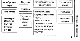Предложение туроператоров отличается по ширине и глубине их рабочей программы. Широкое предложение охватывает множество разнообразных видов путешествий — например, отдых на побережье моря, экскурсионные и образовательные поездки, знакомство с городами. Предложение туроператора считается более глубоким, если для каждого вида путешествий предлагается большой выбор разнообразных продуктов (рис.8).