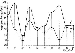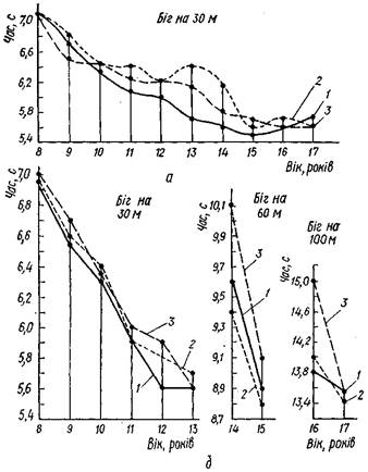 Рис. 1.1 - Розвиток швидкісно-силових здібностей у хлопчиків (а) ідівчаток (б) зрізним рівнем фізичного розвитку: 1 — середнім; 2 — нижче середнього; 3 — вище середнього.
