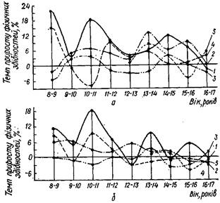 · Значно зростають у підлітковому віці темпи приросту швидкісних можливостей. Так, у хлопчиків цей показник сягає 26 %, у дівчаток він дорівнює 11 %.. Тому для хлопчиків планують велику кількість вправ швидкісного характеру. Виняток становить період а 12 до 13 років, коли рекомендується середній обсяг навантажень, бо темп приросту силової здібності в цей час становить 2 %. У дівчаток великий обсяг фізичних вправ силової спрямованості допускається з 12 до 13. років; у інші роки — обсяг середній.