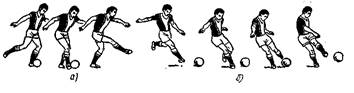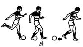 Зупинка внутрішньою стороною стопи (Рис. 5, а). Для зупинки м'яча, що котиться, нога виноситься назустріч м'ячу. Стопа повернута назовні на 90°. У момент зіткнення м'яча і стопи нога відводиться назад до рівня опорної ноги.