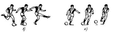 Удар внутрішньою стороною стопи застосовується в основному при коротких і середніх передачах, а також при ударах із близької відстані (Рис. 1, а). Ударний рух починається з одночасного згинання стегна і повороту назовні ударної ноги. У момент удару і проводки стопа знаходиться строго під прямим кутом до напрямку польоту м'яча.