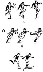 Рис. 7. Фінти: а – «відходом» з переносом ноги через м'яч; б – «ударом»; в – «зупинку»
