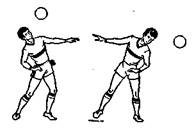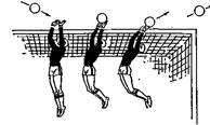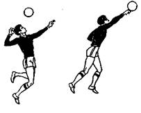 При ударі в стрибку виконується поштовх нагору двома або одною ногою (Рис. 3, б). Після відштовхування тулуб відхиляється назад. У найвищій точці стрибка реалізується удар по м'ячу.