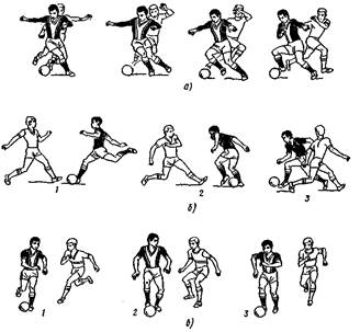 Відбирання м'яча в підкаті дає можливість опанувати м'ячем, що знаходиться на відстані більш 2 м від гравця. Відбирання виконується звичайно ззаду або збоку. Гравець, що атакує, зближаючись із супротивником, у падінні викидає ноги вперед. Сковзаючи по траві, він створює перешкоду на шлях м'ячу або вибиває його ногою (Рис. 8, б).
