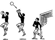 Зупинка стегном. Необхідно розташувати стегно під прямим кутом до м'яча, що летить (Рис. 5, в). М'яч стикається із середньою частиною стегна. Поступальний рух проводиться вниз-назад.