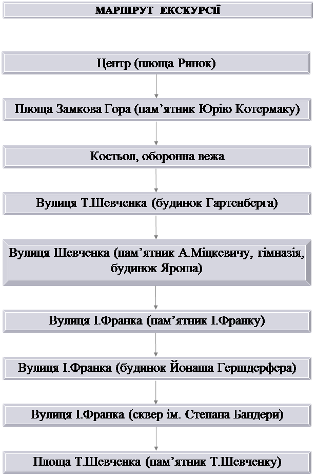 4.3 Маршрут "Франко і Дрогобич" включає: "нормальна школа", гімназія, пам’ятник І.Франкові, місця проживання письменника у місті.