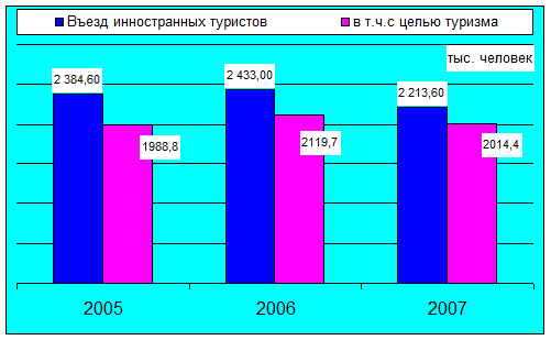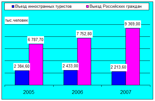 Въезд иностранных туристов в Россию в 2007-2005 гг (человек)