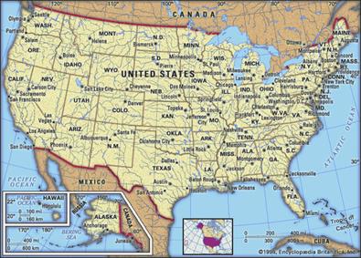 Соединенные Штаты Америки располагаются в центральной части североамериканского континента, занимая обширную площадь между 25-й и 57-й параллелями северной широты. С востока омываются водами Атлантики, на юге - Мексиканским заливом Карибского моря, на западе и юго-западе - Тихим океаном, северное и северо-западное побережья Аляски - Северным Ледовитым океаном.