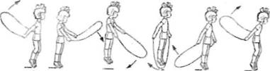 Прыжок в отличие от ходьбы и бега не является циклическим движением, а состоит из нескольких последовательно и слитно выполняемых действий. Прыжки через скакалку хороши тем, что не требуют сильного отталкивания, прыжок над скакалкой невысокий. Поэтому ноги при приземлении сгибаются настолько, чтобы выполнить следующий толчок, носки после отталкивания вытянуты, корпус прямой. Скакалку надо вращать кистями и предплечьями рук, плечи не должны двигаться. Прыгать можно через короткую и длинную скакалку. Более легкими считаются прыжки через длинную скакалку, которую держат или вращают двое, третий прыгает. В этом движении выполняются только прыжки, ребенок свободен от вращения скакалки. Но в, то, же время он должен хорошо чувствовать предлагаемый ему темп подскоков, подстраиваться к нему, а это вызывает известные трудности.