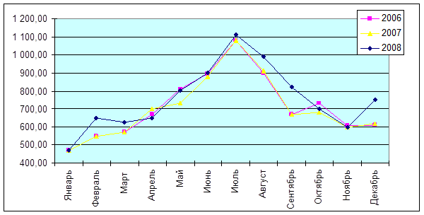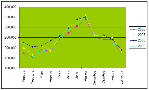 Как видно из графика, количество пассажиров размещенных во флотелях с каждым годом все возрастало, набольшее количество туристов пришлось на 2008 год и составило 300000 чел.