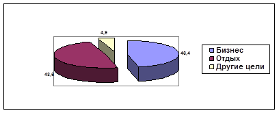 В 2009 году сложилась немного другая ситуация. Соотношение туристов, прибывших в страну с целями бизнеса и для отдыха практически одинаковое, а наименьший показатель у туристов, прибывших с другими целями. [Рис. 10]