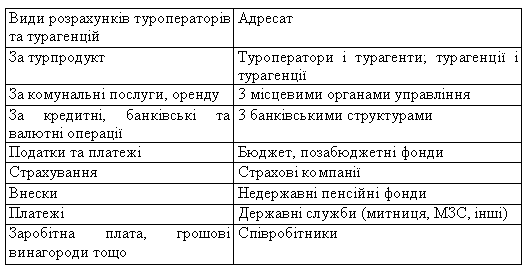 Отже, угода – це обмін цінностями між партнерами (споживачем та виробником турпродукту), що здійснюється на добровільній основі, передбачає покращення становища сторін і укладається в економічно-правових межах певного туристичного ринку. Механізм, який регулює цю діяльність і є механізмом фунціонування ринку туристичних послуг, що грунтується на законі попиту/пропозиції. туроператори та турагенції, підприємства з виробництва послуг і товарів туристичного призначення, місцеві та державні органи управління, державні та недержавні організації. Характер фінансових відношень обумовлений специфікою діяльності даних суб'єктів (таблиця 2.1).