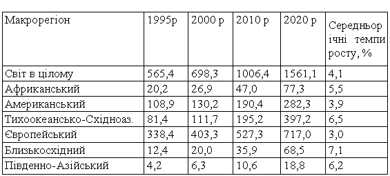 Таблиця 2.3. Прогноз обсягів міжнародних туристичних потоків в розрізі регіонів ВТО, млн. осіб