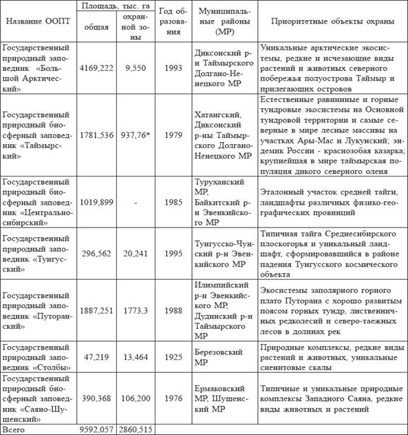 Всего в Красноярском крае создано семь заповедников (табл.1), а также национальный парк "Шушенский бор", природный парк "Ергаки".
