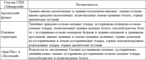 Территория заповедника представляет собой эталонные участки земной поверхности, на которых представлены почти все природные зоны Таймыра: арктические ("Арктический филиал"), типичные ("Основная территория"), южные (участок "Ары-Мас") тундры и лесотундра (участок "Лукунский"), а также уникальные горные тундры хр. Бырранга (табл.1).