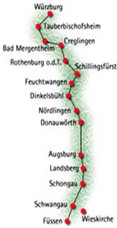 Маршрут «Романтическая дорога Германии» охватывает следующие города: Мюнхен - замки Нойшванштайн и Хоэншвангау - Фюссен - Шонгау - Ландсберг ам Лех - Аугсбург - Нёрдлинген - Валлерштайн - Динкельсбюль - Ротенбург об дер Таубер - Бад Мергентхайм - Лауда Кёнигсхофен – Вюрцбург- Бамберг – Нюрнберг.
