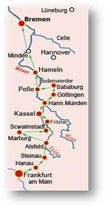 Маршрут пролегает с юга на север, от Франкфурт-на-Майне до Бремена. Проходит через такие интересные города, как Альсфельд. В этом городе домики так красивы и своеобразны, что напоминают страницы детских сказок. На русских сайтах их называют «пряничными». В городе проводится традиционный фестиваль, кульминацией которого является костюмированное шествие по узким средневековым улочкам и площадям. Здесь герои сказок гуляют по улицам, летают феи и эльфы, а местные жители одеваются в традиционные народные костюмы. В городе большое количество памятников сказочным героям, Дом сказок и Музей сказок.