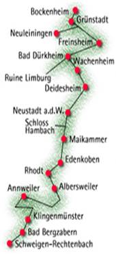«Вайнштрассе» спускается из Бокхейма к югу и заканчивается в Швейгене. Протяженность маршрута: 100 км. Незабываемые впечатления оставляет долина реки Мозель. Самая интересная часть ее - извилистый 200-километровый участок между древним Триром, основанным 2000 лет назад, и Кобленцем, расположенным там, где Мозель впадает в Рейн.