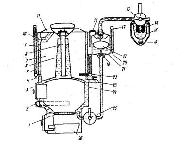 Кипятильник (см. рис.) состоит из корпуса 9, зольника с ящиком 26, крышки 11 с гнездом для верхнего нагревательного элемента 8, клапана 18 с поплавком 19, регулирующим подачу сырой воды в кипятильник, водоотстойника с сетчатым фильтром 14, очищающим сырую воду от механических примесей, двух боковых электронагревательных элементов 2, указателя уровня кипяченой воды 5, ртутного термометра 22, спускного крана 25 и водоразборного крана 23.