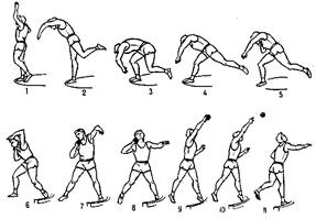Рис. 2.6 - Техника толкания ядра из исходного положения «спиной» к направлению толкания