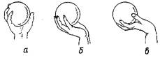 Способы держания ядра зависят от силы пальцев кисти и от подготовленности занимающегося. Ядро может располагаться: а) на ладони, б) на основании указательного, среднего и безымянного пальцев и на первых фалангах указательного, среднего и безымянного пальцев. Большой палец и мизинец поддерживают ядро сбоку (рис. 2.1).
