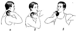 Взятое в руку одним из этих способов ядро укладывается к боковой поверхности шеи, в области надключичной ямки. Учитывая изучаемый способ толкания, а также анатомическое строение руки, место ядра может быть либо ближе к уху (рис. 2.2, а), либо ближе к подбородку (рис. 2.2, в).