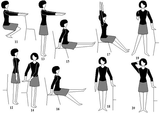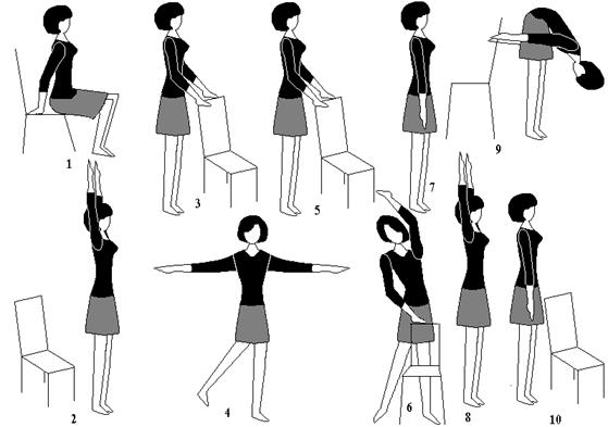 Примерный комплекс упражнений производственной гимнастики для работающих стоя (исходное положение во всех упражнениях, кроме четвертого упражнения, - сидя на скамейке):