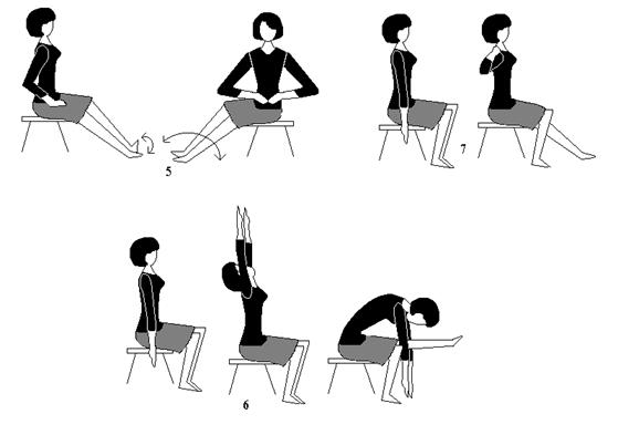 6 - сидя на стуле, руки вытягивают вдоль тела, затем, прогибаясь назад, поднимают руки вверх, ноги также несколько приподнимают, носками касаясь пола. Наклоняясь вперед, делают хлопок руками под вытянутой ногой, возвращаются в исходное положение. То же с другой ноги. Повторяют 6-8 раз, дыхание произвольное.