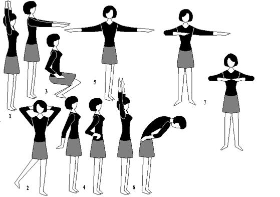 1- потягивание, руки подняты над головой, кисти сцеплены “в замок” - вдох, руки опускают - выдох. 2 - ногу отставляют в сторону на носок, руки за голову - вдох, опуская руки и приставляя ногу - выдох. 3 - руки вытянуты вперед, кисти расслаблены и опущены вниз. Приседая, руки вниз - выдох, выпрямляясь руки назад, поднимаются на носки - вдох. 4 - прыжки на месте на носках, руки на поясе. 5 - руки в стороны, повороты туловища и головы попеременно вправо и влево. 6 - поднимая руки вверх прогибаются назад - вдох, затем наклоняются вперед, держа руки на поясе - выдох. 7 - ноги расставлены на ширину плеч, руки перед грудью. Попеременно отводя то правую, то левую руку в сторону, делают вдох, опуская руки - выдох.