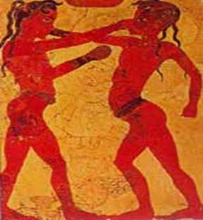 Возникновение кулачного боя как спорта теряется в веках. Египетские иероглифы, относящиеся еще к сороковому веку до нашей эры, изображают воинов, которые ведут кулачный бой в примитивных перчатках – кожаных бинтах. На Вавилонском барельефе, датируемом вторым тысячелетием до н. э. изображен кулачный бой.[1] При раскопках в окрестностях Багдада найдено много плит с изображением кулачного боя. Нужно полагать, что кулачный бой распространился из Египта на остров Крит и в Грецию. Раскопки Миноского лабиринта показали, что кулачный бой известен еще до возникновения греческого государства в эпоху расцвета Эгейской культуры.[2]
