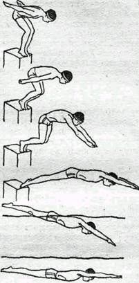 Вход в воду и скольжение . После полета вход в воду начинается с погружения ног. Почти одновременно с ногами воды касаются руки, а затем туловище. Как только руки погрузятся в воду, голова опускается на грудь, тело выпрямляется, а иногда даже слегка сгибается в пояснице. Скольжение происходит на глубине 40—60 см по траектории, напоминающей полого-вогнутую кривую.