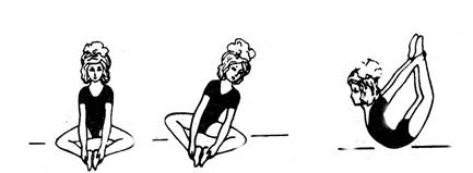 И.п.: упор лежа на бедрах, ноги врось. 1-4 – прогнуться, согнуть ноги в коленях, головой коснуться стоп, 5-6 – удержать принятое положение, 7-8 – И.п.