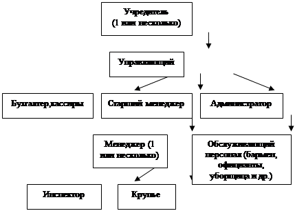 Казино организуют учредители, для управления им назначают управляющего (директора), которому подчиняются все, нижестоящие по служебной лестнице (менеджеры, бухгалтеры, кассиры, администраторы). Менеджерам подчиняются крупье, инспектора (см. приложение, рис.3).
