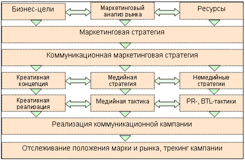 Для того, чтобы рекламный процесс был достаточно высоко эффективным, ему должны предшествовать соответствующие маркетинговые исследования, стратегическое планирование и выработка тактических решений, диктуемые сбытовыми целями рекламодателя и конкретной обстановкой на рынке.[1, c.29-30]