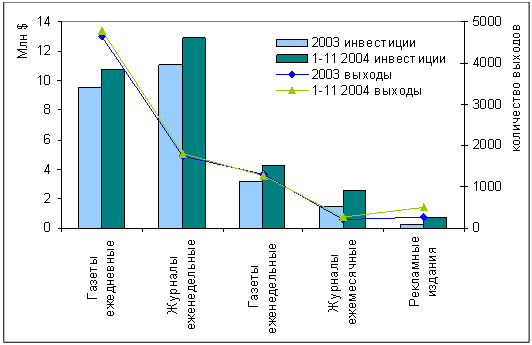 Приложение 2. Распределение рекламных инвестиций и количество выходов рекламы по типам изданий в банковской категории.