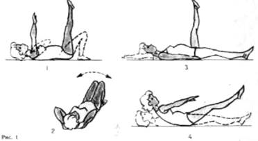 8.И. П. — лежа на спине, руки вдоль туловища. Приподнимите обе ноги и, одновременно приподняв плечи, потянитесь руками к пальцам стоп. Вернитесь в И. П. Женщинам со слабыми мышцами живота это движение сначала покажется трудным, но с нарастанием тренированности все сложности исчезнут, и можно будет довести количество повторений до 20—25 раз в среднем темпе, без задержки дыхания (рис. 1,4).
