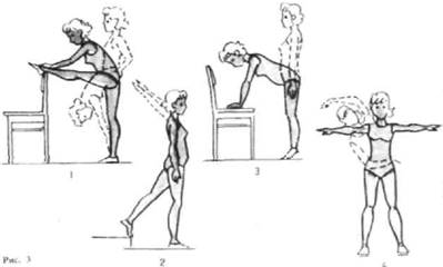 1. Встаньте на расстоянии шага от спинки стула. И. П. — стоя на левой ноге, правая вытянута вперед носок опирается о спинку стула, руки на поясе. Наклоняйте туловище вперед и скользите руками по правой ноге вперед. Вернитесь в И. П. Наклоняйте туловище вперед и, слегка повернувшись влево, скользите руками но левой ноге вниз (рис. 3,1). Проделав к каждой ноге по 5—7 наклонов, поменяйте положение ног и повторите еще 5 - 7 раз. Темп выполнения движений медленный. Дыхание свободное, равномерное.