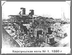В 1867 году начинается строительство Курско-Харьковско-Азовской ж/д и на данной территории появляется рабочий посёлок, который был назван в честь инженера Горлова — Горловкой. В поселке строятся бараки, мастерские и т.д., начинается добыча угля в промышленных масштабах. В период 1871 по 1874 годы была возведена шахта "Корсунская копь 1" ("Кочегарка"), которая включала в себя 2 шахты. В 1879 году на этом крупнейшем предприятии угольной промышленности Донбасса трудилось больше 1000 рабочих, добывалось около 80 тысяч тонн угля. В 1889 году было создано "Общество южнорусской каменноугольной промышленности", которое добывало 42 миллиона пудов угля и 12миллионов пудов кокса.