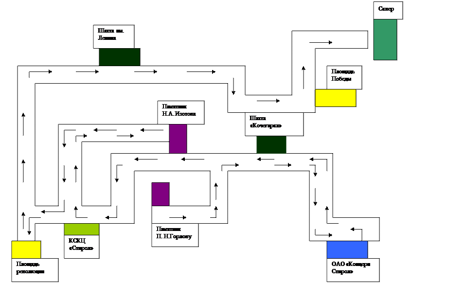 | От шахты им. Ленина к площади Победы по ул. Матросова | Площадь Победы | Центральные улицы города | 7 мин Переезд 10 мин |