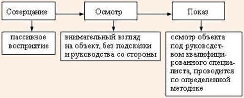 Показ вырастает из таких действий человека, как созерцание и осмотр. Если при созерцании и осмотре никто не демонстрирует объект, отсутствует руководитель, то возникает пассивность восприятий предметов зрительного ряда.