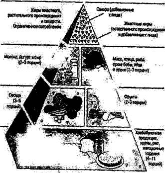 Співвідношення вуглеводів, жирів і білків в здоровій їжі повинно складати в процентах 60:30:10. Образно це ілюструє так звана "піраміда здорового харчування" (мал.2.2.), запропонована американськими спеціалістами. В ній об'єми різних продуктів представлені в пропорціях різних продуктів (Пафоренбаргер Ольсен, 1999).