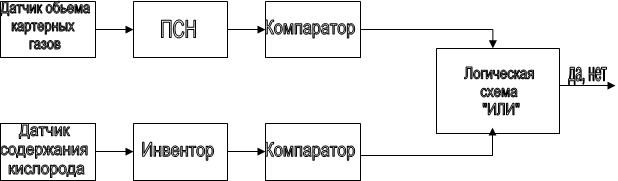 Как было сказано выше при снижении компрессии увеличивается обьем картерных газов и содержание в них кислорода.Таким образом о наличие нормальной компрессии можно судить контролируя одновременно эти параметры. При этом на выходе датчика обьема картерных газов, установленного в системе вентиляции картера, должен присутствовать сигнал указывающий на большое количество газов, на выходе датчика обьемного содержания кислорода сигнал, показывающий высокое содержание кислорода. При использовании в устройстве принятия решения о наличии нормальной компрессиии в цилиндрах двигателя элементов вычислительной техники, значительно упращающих принятие решения, необходимо чтобы сигналы, поступающие с датчиков на схему принятия решения имели дискретное значение, то есть значение логического нуля или значение логической единицы.Поскольку сигналы на выходе датчиков имеют аналоговую форму, они предварительно должны быть представлены в форме логического нуля либо логической единицы. Такое представление может быть выполнено путем использования специальных сигнализирующих устройств. Так, чтобы сигнал с выхода датчика обьема картерных газов в рассматриваемом случае поступал на выходы схемы принятия решения в дискретной форме можно использовать преобразователь сопротивления в напряжение (ПСН) и компаратор. Схема ПСН позволяет преобразовывать сопротиление, снимаемое с датчика обьема картерных газов в напряжение, причем преобразование может быть не только линейным, что позволяет проводить регулировку системы контроля за компрессией посредством изменения характеристик ПСН. Схема компаратора работает таким образом, что при высоком уровне входного сигнала, то есть при привышении порога срабатывания сигналом на выходе компаратора будет логическая единицы. Причем порог срабатывания в схеме компаратора регулируется и может выбираться в широком диапазоне. Таким образом, регулируя порог срабатывания в схеме компаратора, всегда можно добиться, чтобы при определенном значении обьема картерных газов на выход схемы принятия решения поступал сигнал в виде логической единицы. Чтобы сигнал о высоком содержании кислорода поступал на вход схемы принятия решения также в виде логической единицы необходимо с компаратором последовательно включить еще и схему инвертора. В этом случае на выходе инвертора если на его входе, то есть на выходе компаратора, будет сигнал логического нуля, будет сигнал логической единицы, в противном случае сигнал логического нуля. То есть использование инвертора (устройство принятия решения о наличии нормальной компрессии в цилиндрах двигателя) в данном случае на входе схемы принятия решения при повышенном содержании кислорода в картерных газах может обеспечить наличие сигнала логической единицы. Для согласования такой работы датчиков в этом случае можно использовать логическую схему «ИЛИ». Она работает таким образом, что при наличии хотя бы на одном ее входе сигнала логической единицы на ее выходе будет также сигнал логической единицы.