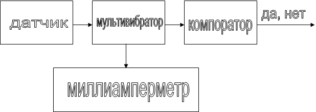 Для измерения частоты коленчатого вала и представления ее в цифровом или аналоговом виде необходимо частотный сигнал, поступающий с датчика преобразовать с помощью ждущего мультивибратора в ток, сила которого будет пропорциональна частоте вращения коленчатого вала. Полученное значение силы тока, измеренное с помощью миллиамперметра будет указывать частоту вращения коленчатого вала. Для того чтобы исключить вращение коленчатого вала с чатотой ниже или выше допустимых значений необходимо применить схему компаратора описанного выше, котрый будет выдавать сигнал логической еденицы в случае выхода частоты вращения за допустимые пределы. Схема контроля в этом случае будет выглядеть так: