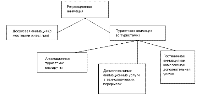 Различие понятий «анимация», «рекреационная анимация», «гостиничная анимация», «туристская анимация» связано с многообразием существующих форм и программ досуговой анимационной деятельности. В этом поможет разобраться схема указанная на Рис.1.