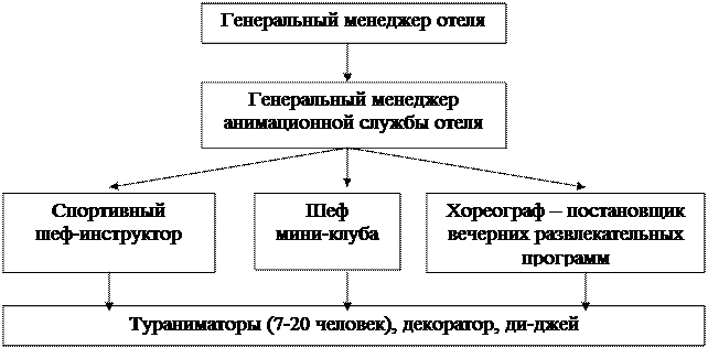Отдел шоу-анимации . Набираются профессиональные танцоры, музыканты, артисты. Также в отделе постоянно работает профессиональный хореограф, который часто совмещает обязанности режиссера-постановщика вечерних развлекательных программ, ди-джей, декоратор и костюмер. Остальные аниматоры привлекаются к работе по мере надобности. Шоу-программы чаще всего включают юмористические сценки, отрывки из знаменитых мюзиклов, танцевальные спектакли. Для развлечения гостей иногда устраивается стриптиз-шоу. Отдел шоу-анимации отвечает за проведение дискотек (как взрослых, так и детских), обучение отдыхающих танцевальным движениям, исполнению песен и за проведение других музыкально-развлекательных мероприятий.